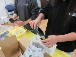 多肉を育てやすいスリット入りの鉢に土を入れる
